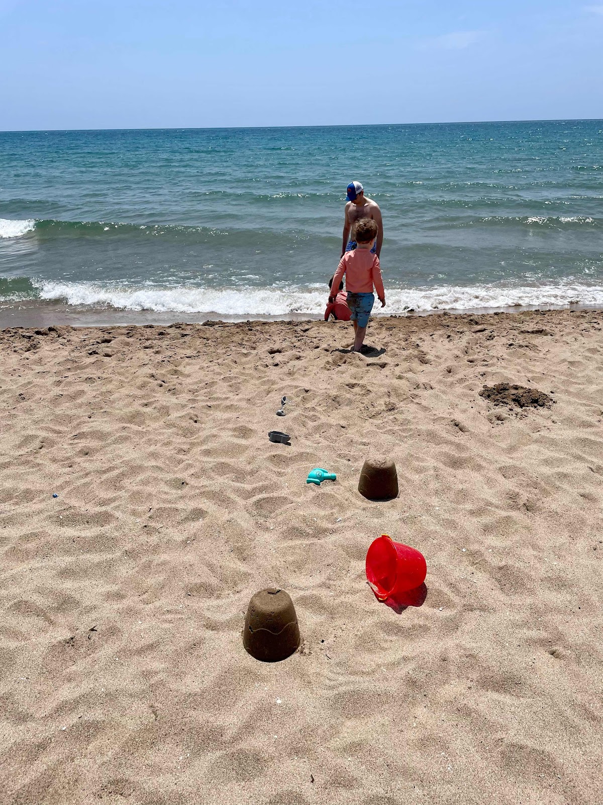 When we got to Castelldefels, the boys, rejuvenated by their car snoozes, and inspired by the sights, asked to go to the beach. We had a blast playing in the surf and sun with the boys and Lorena, building sand castles and splashing in the Mediterranean Sea. Nico, in particular, enjoyed crawling around like a Sports Illustrated model in the waves crashing into the beach.