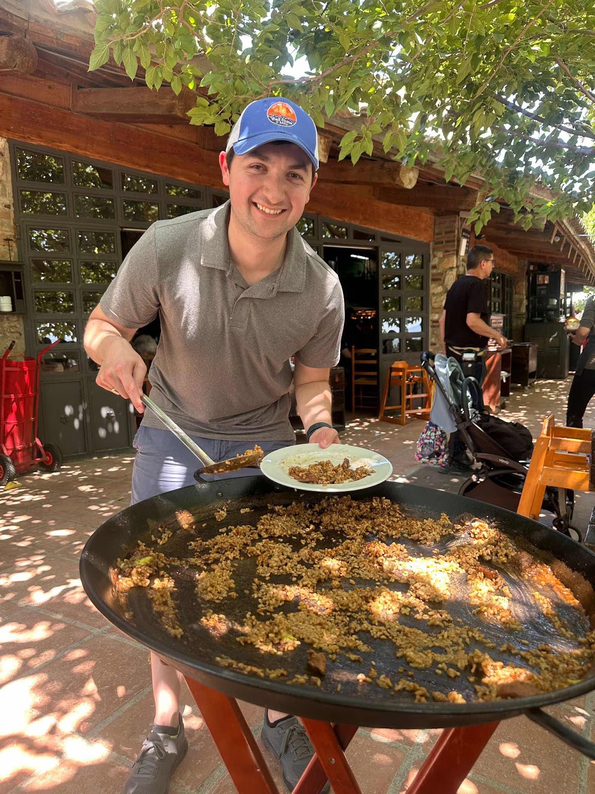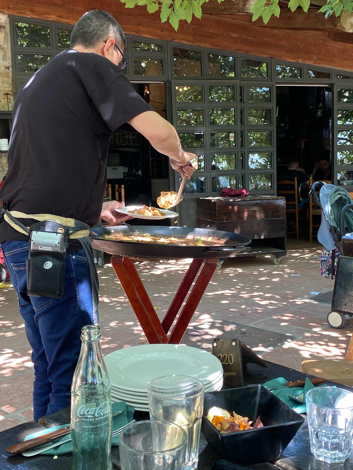 After a couple hours at Montserrat, we hopped back in our rental car and followed Angel and Imma’s cars to the Masia Vinyanova restaurant, where we had a long and delicious Catalan lunch with Elena’s family — her parents, Imma and Carlos, Angel and Angel, and Elena’s brother Jordi and his wife and their two sons. The meal was incredible. Over several hours, we started with some charcuteries, toasted bread, and tomato with olive oil; then had a 15-person veal paella; and finished with fantastic cheesecake — all on a hillside overlooking vineyards and with great company. We really appreciate the Ricart Romero family’s gracious hospitality and the chance to meet them in person. (There are three pictures of the paella to appreciate its true scale.)