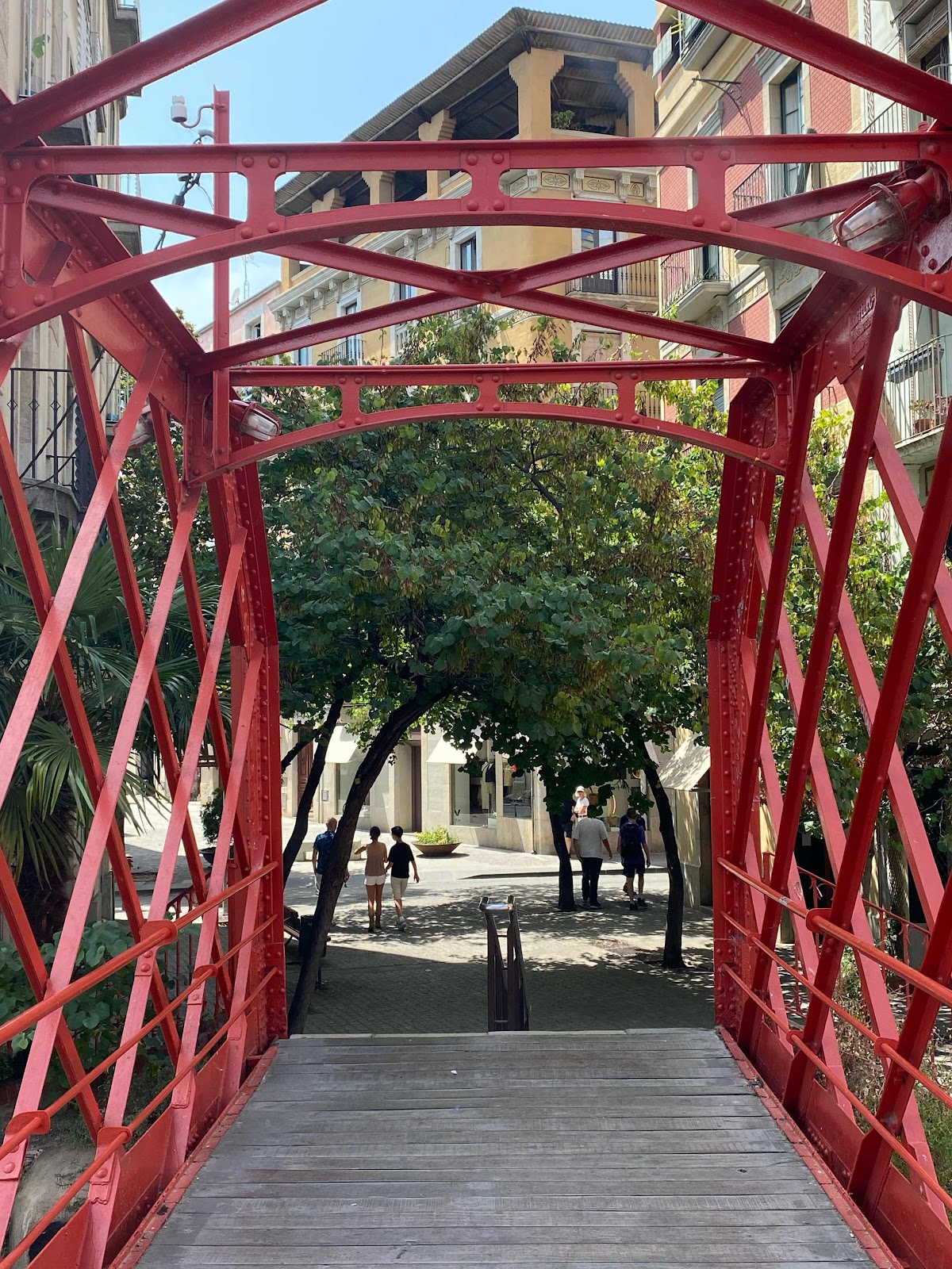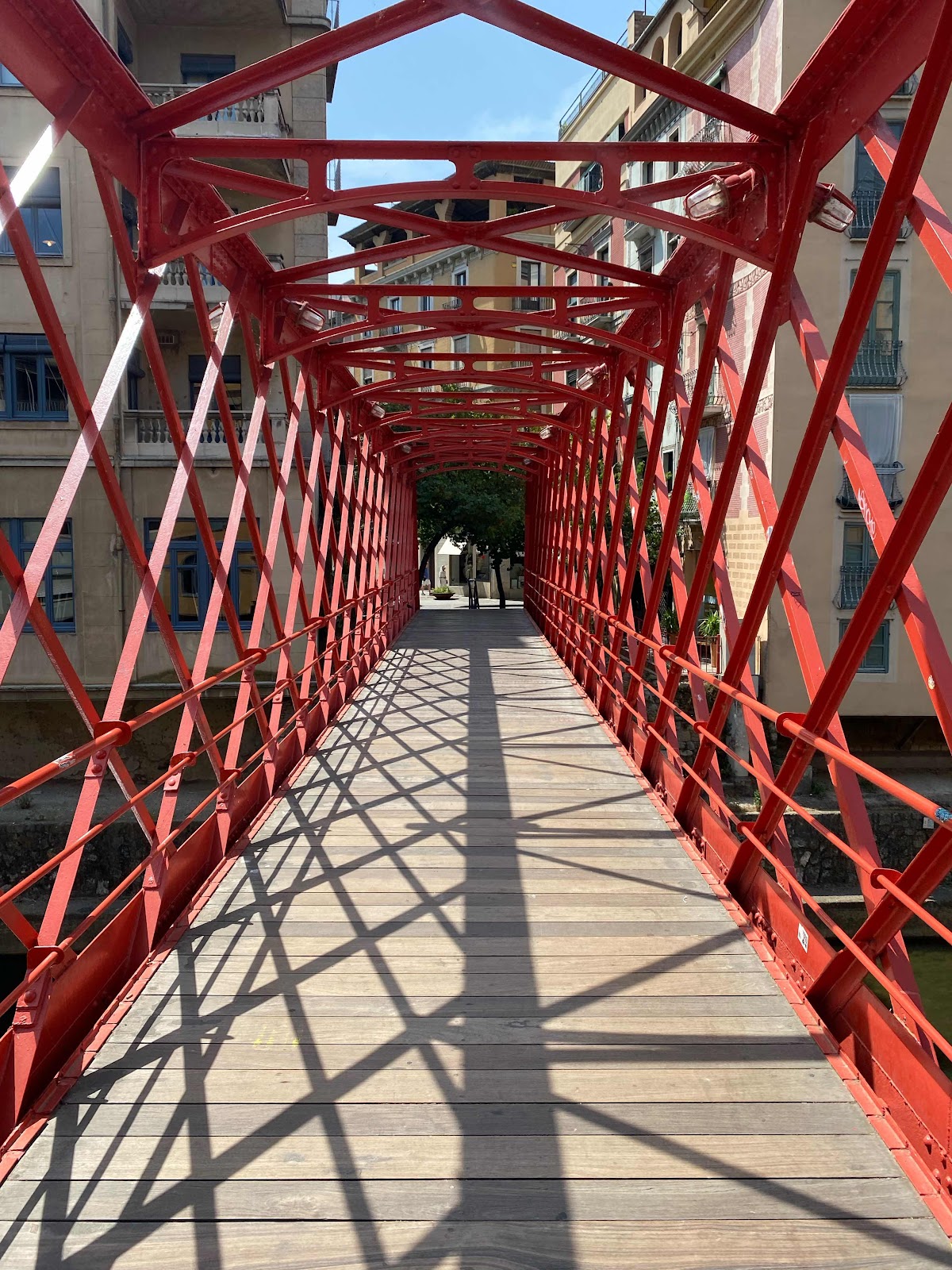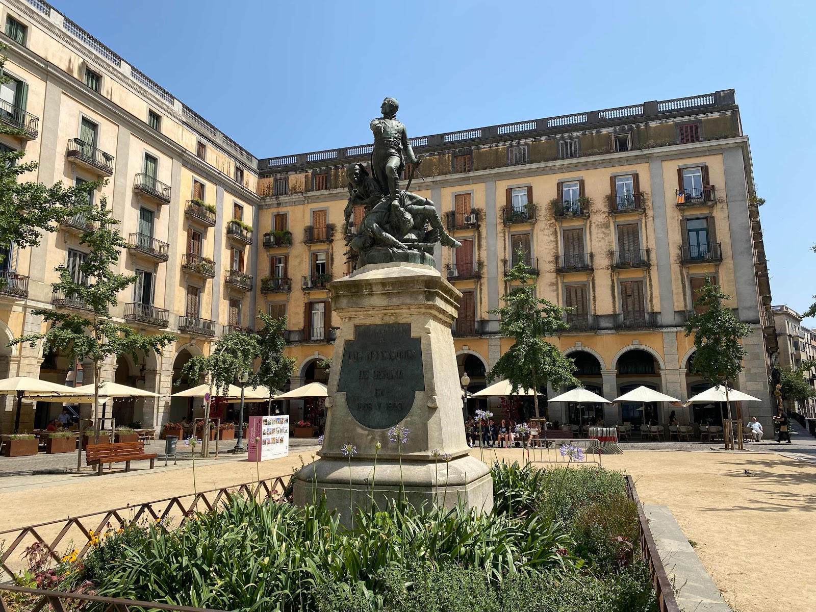 “Bikinis” (paninis made from cheese and ham), tasty focaccias, butifarra sausage, and patatas bravas, we made it to the historic Pont de les Peixateries Velles, also known as the Eiffel Bridge as it was built by Gustave Eiffel’s company in 1876 to span the Onyar River and connect the historic and new centers of Girona. The boys loved crossing the bridge and seeing the beautiful houses on the water. We then darted to the Plaça Catalunya.